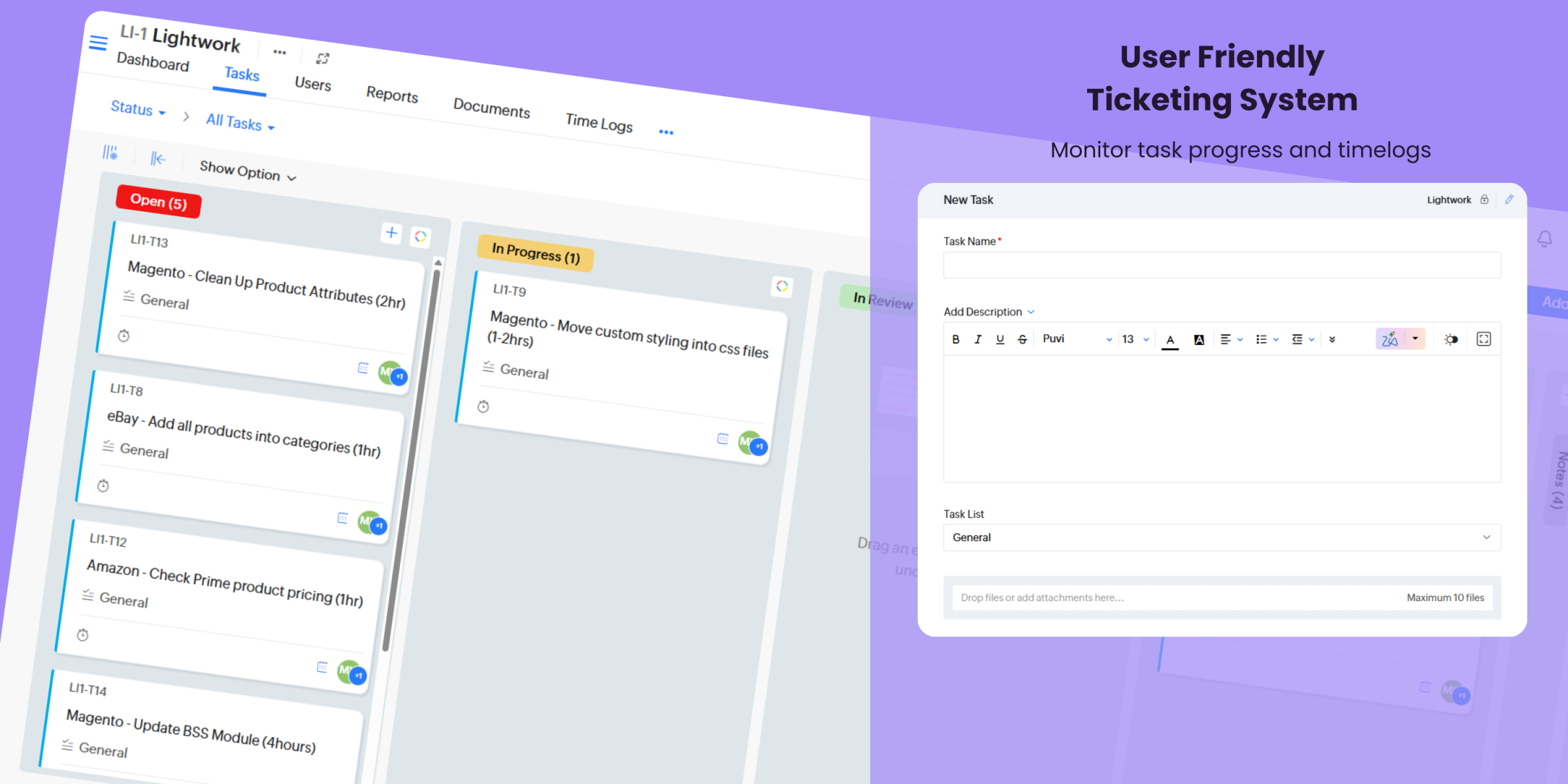 No more chasing developers. All Lightwork clients are provided with their own secure ticketing portal